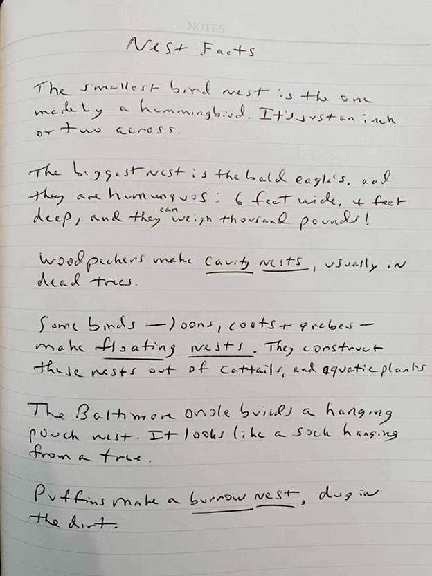 My most important book is one that has never been published, and never will be. My writer’s notebook feeds my other, published books. I use my writer’s notebook to collect things anything that I find interesting, surprising, funny, weird or shocking. Exactly what things do I collect? Well, you name it: I collect quotes, sentences from books or articles, jokes, rock lyrics, facts, stats. I collect ideas for books or poems I might write. For instance, right now I’m playing around with an idea to write a picture book about bird nests. (Don’t tell anybody!) Here’s a page from my writer’s notebook: